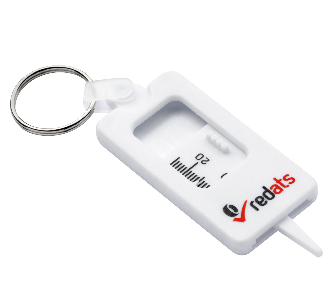 The cheapest on the market and the most practical tread depth gauge. Clip it to your keys and keep it always at hand. Readable measure from 1 to 20 mm scaled every 1 mm. Slide block. Economical and practical gift for every driver.