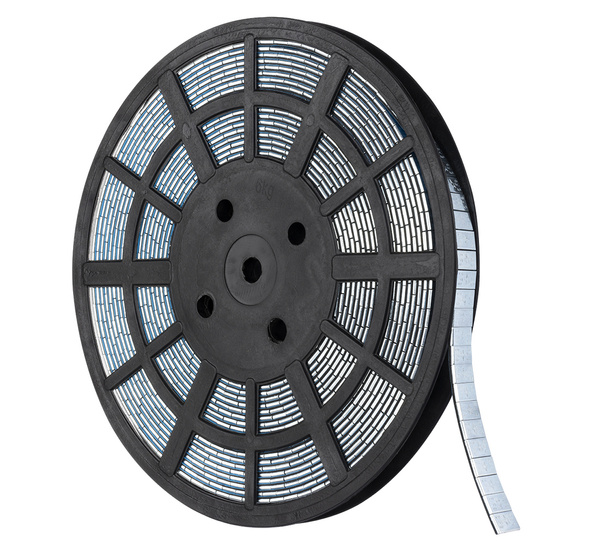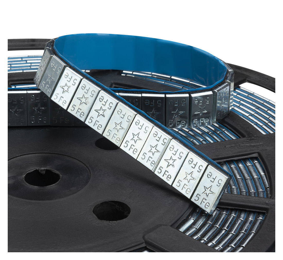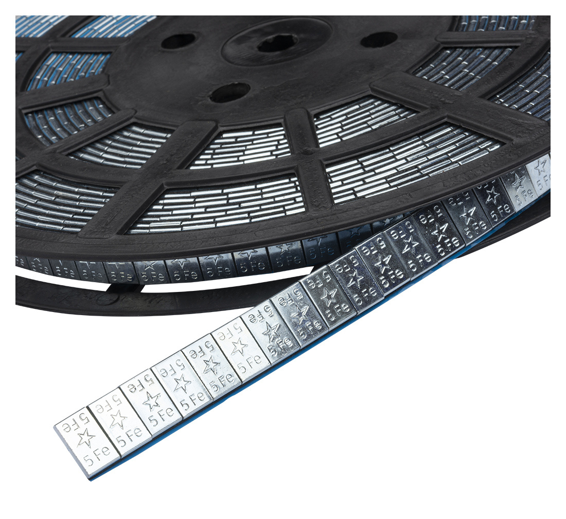 A roll with adhesive counterweights for alloy wheels, used for balancing the wheels on cars.