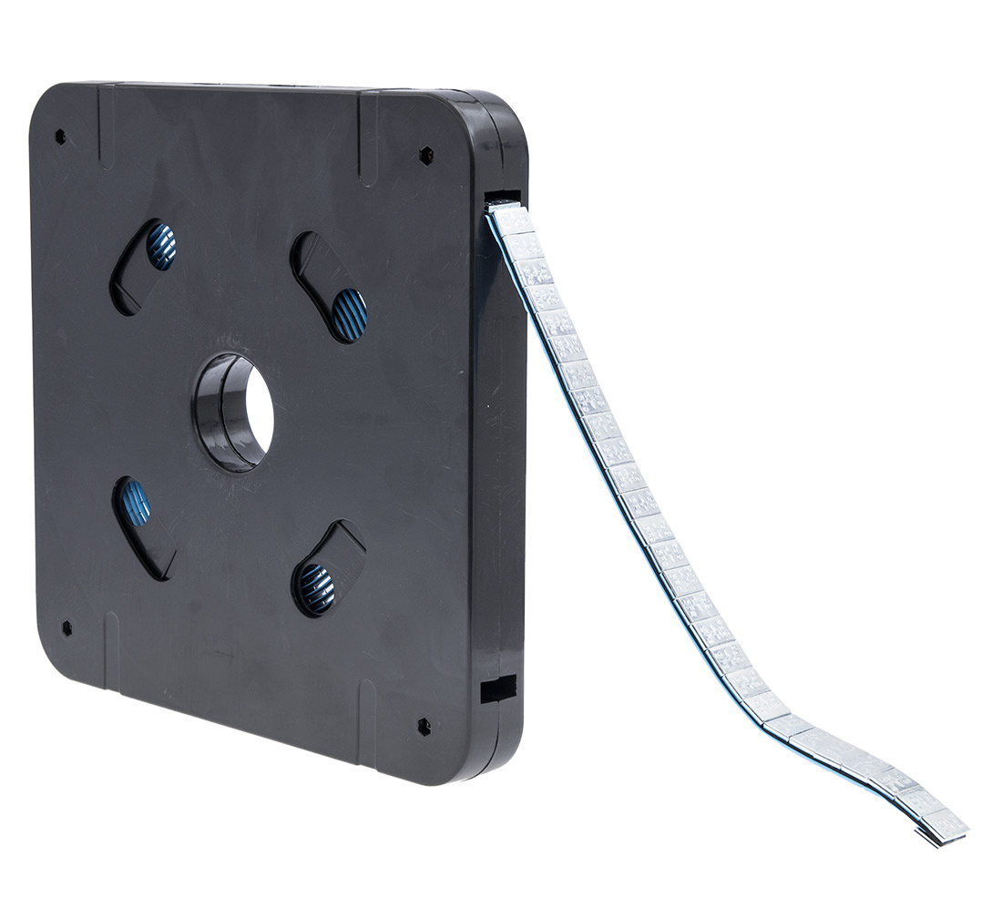 Weights are wound on a spool enclosed in a cartridge that guarantees quick and comfortable work. A drum set with a balancer allows rapid development of the tape and cut the required amount of weights. At the same time, the excess can easily be rolled back onto roll.