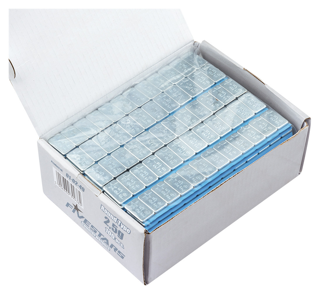 Use of glued weights Polish brand FIVESTARS guarantees easy and precise balancing of all types of aluminum rims. High quality galvanized finish, extremely strong adhesive tape from a well-known manufacturer and very thin thickness of weights are the main advantages of original products with a star. The 2.5g super flat weights, only 2.7mm thick (together with the tape) is a specially created line for narrow clearances between the brake disc calipers and the wheel rim. Bet on customer satisfaction and choose FIVESTARS weights!
