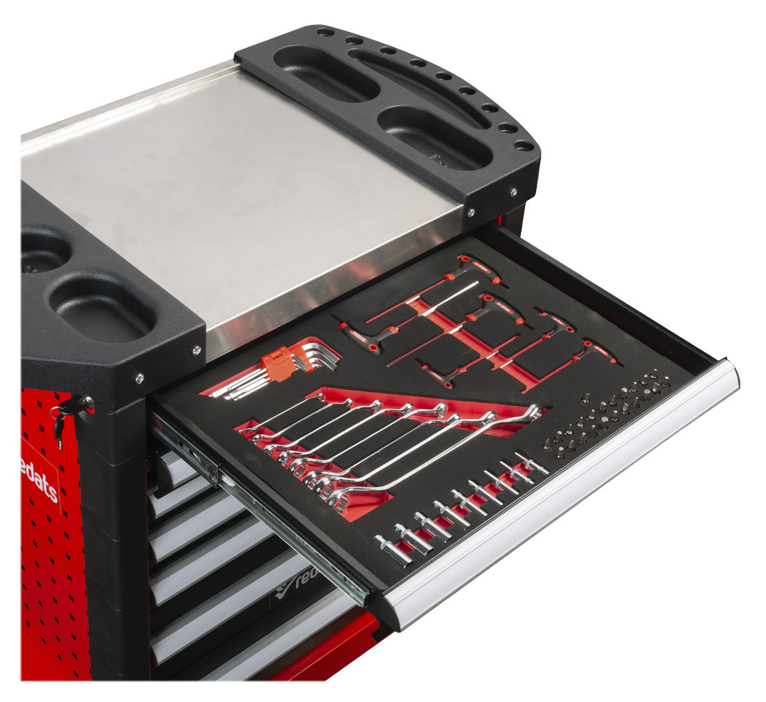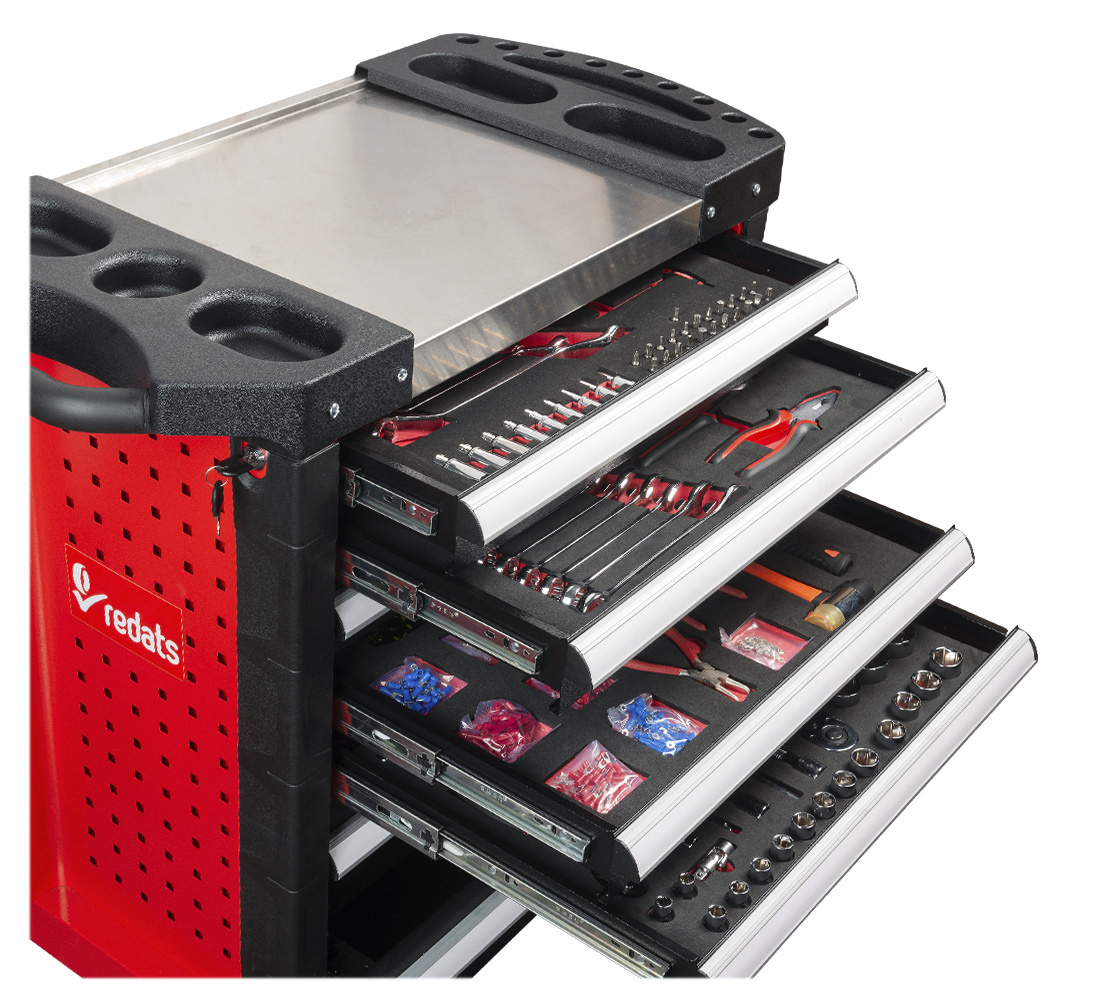 - Robust REDATS workshop trolley with seven drawers and the most commonly used professional workshop tools. Contains 420 parts.