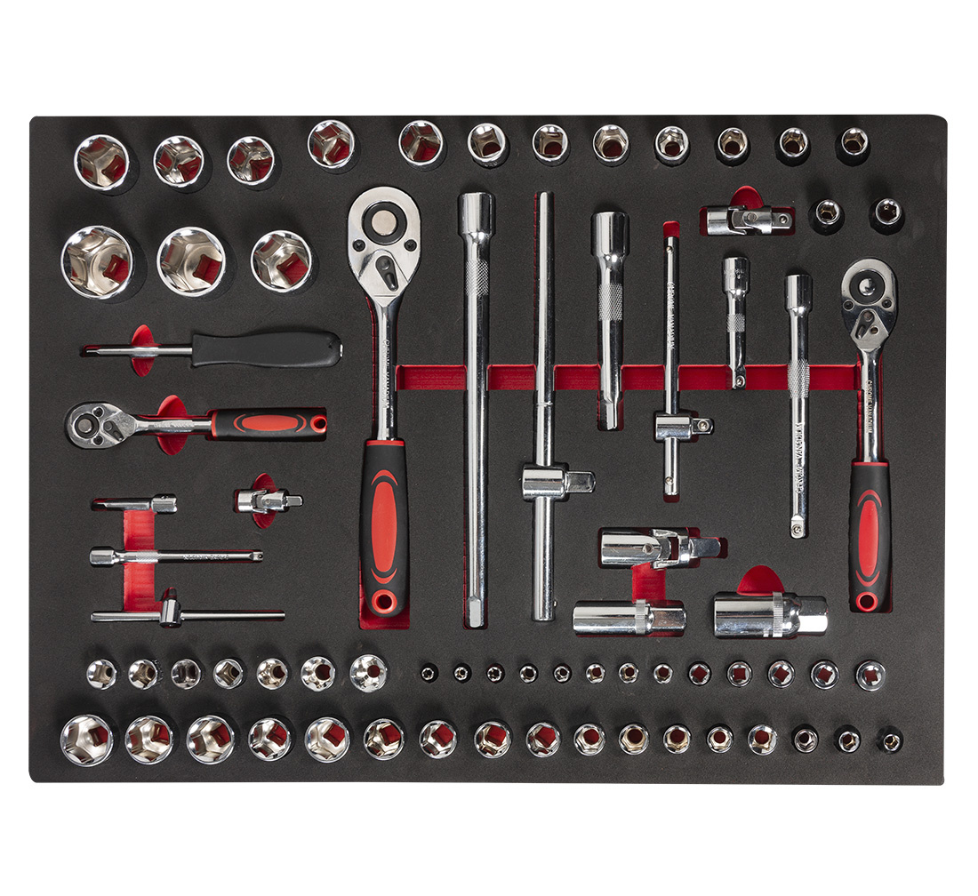 Seven pull-out drawers with high-quality tools and accessories organized into several groups: socket wrenches with ratchets, combination wrenches screwdrivers pliers and allen keys cutters, pliers, hammer. 2 bottom drawers are for oversized tools (to be fill by you)