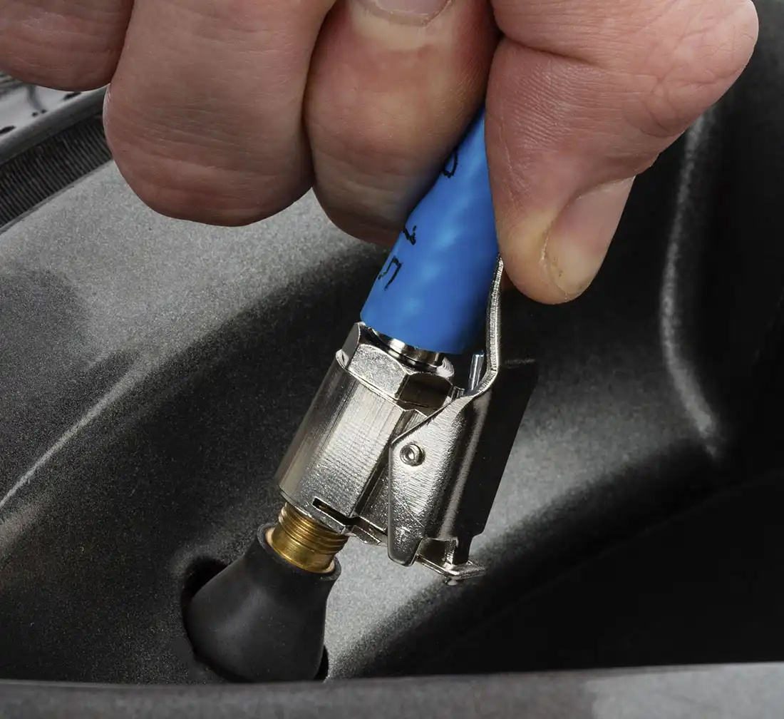 Putting the chuck onto the valve is really easy - it is just two steps. The clamp won't go off, even under high pressure. It works even if the car is parked far from the compressor.