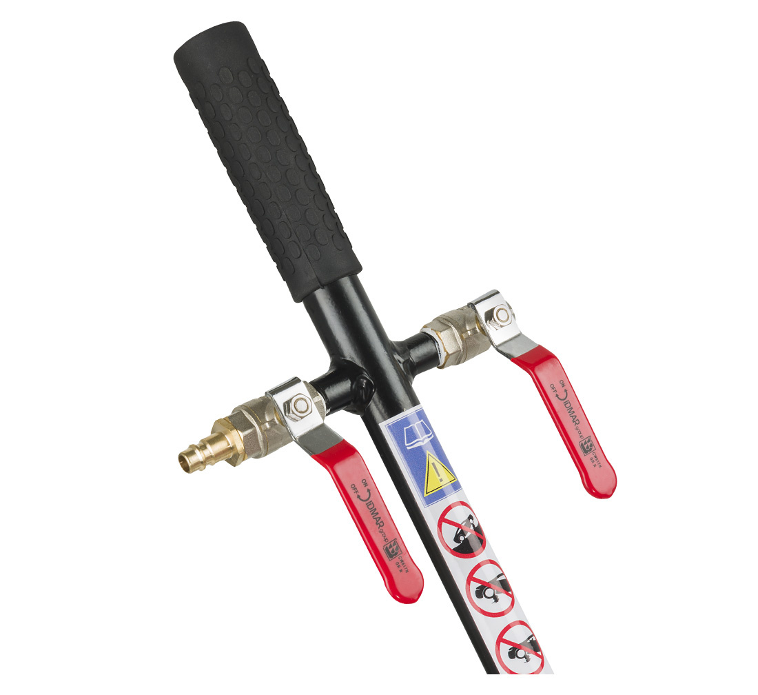 The rubber part on the top of the lift saves the chassis of the car that is being risen and protects its falling off while lifting. There are two valves: inlet and outlet, which provide for perfect tightness of the whole structure, even if you disconnect the hose with compressed air. The safety valve prevents the development of too high pressure, so there is no risk of a cushion blowing. And please note that all air jacks by REDATS have the CE declaration of conformity.