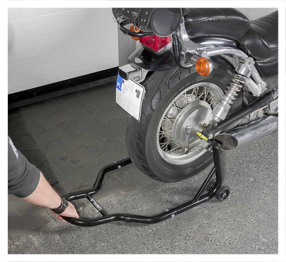 This motorcycle stand is designed in a way that provides safe operation. Special handles protect your hands from any harm.