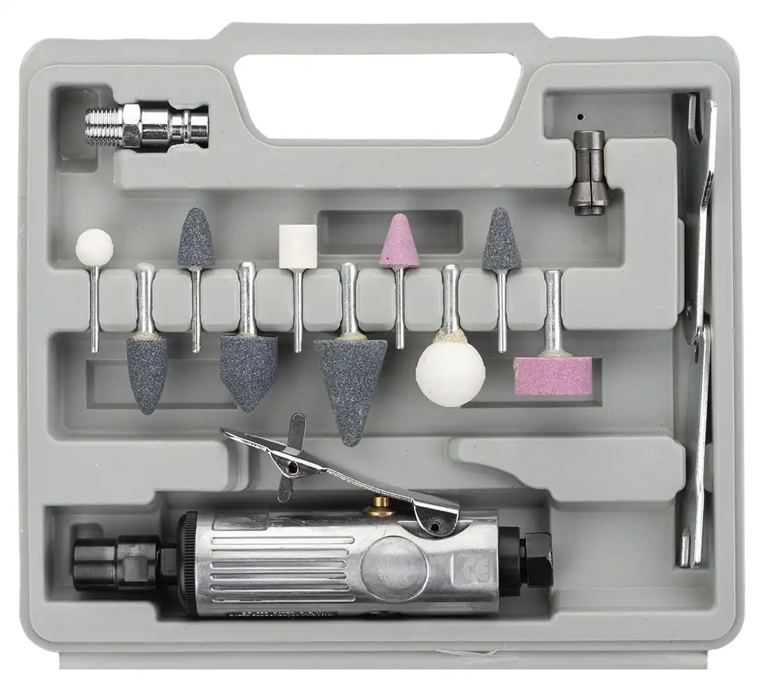 A tyre repair set with a pneumatic drill designed for those dealing with tyre repair. A set of tyre repair grinders for tyre buffing, which means rubber preparation before putting on the glue and repair insert. Variously shaped tyre repair grinders were designed to fit the most common damages of tyres. Easy-to-replace endings (3 mm and 6 mm) mean that the drill can be used with other tools, too. Thanks to a handy case, the set is always ready for use.