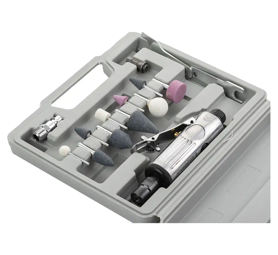 A tyre repair set in a handy case. A high speed tyre repair grinder with a set of stones.