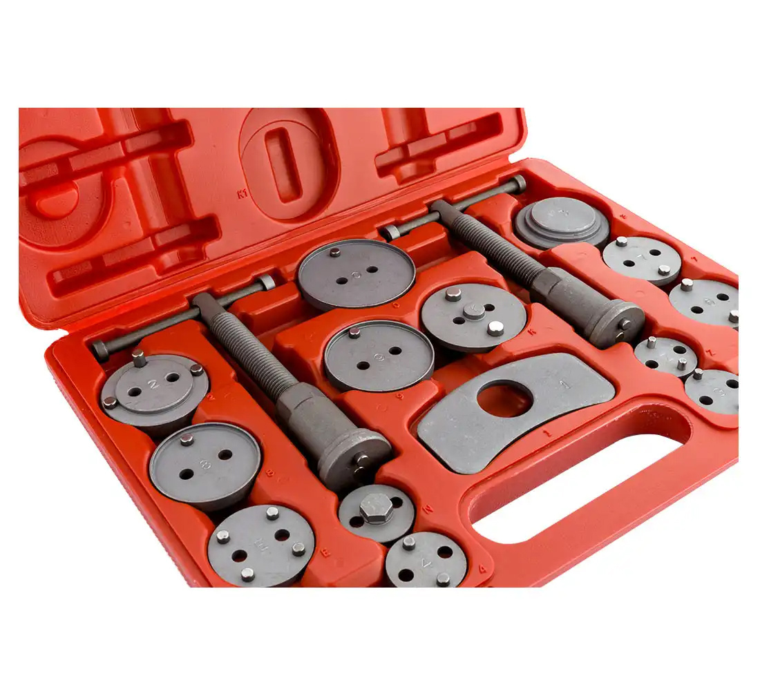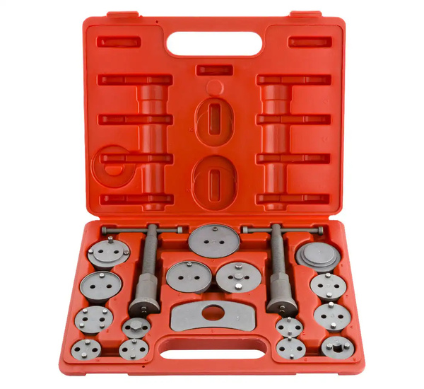 The kit consists of 2 right and left presses, an auxiliary bar for braking the brake caliper and 15 adapters adapted to the size of the brake pistons used in most of the cars.